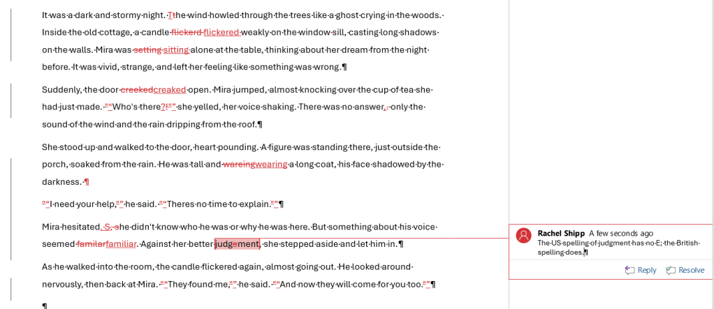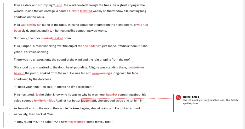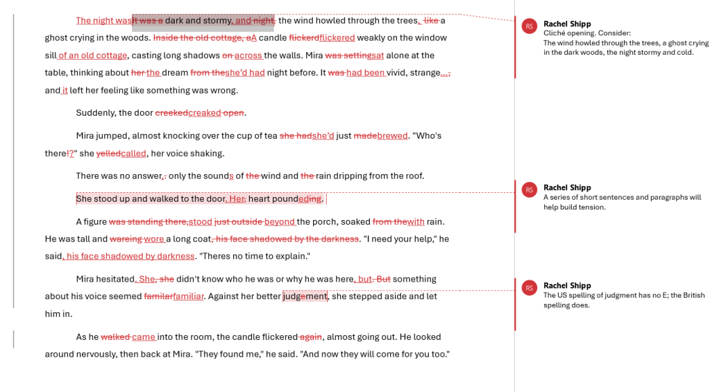 Finally, this is my line edit of the story. Here, you can see where I’ve focused on the syntax and mood of the story. Along with changing the text, I’ve explained to the imaginary author how to add tension and avoid clichés. I also do a decent amount of fact checking in my line edits, but not every editor does.